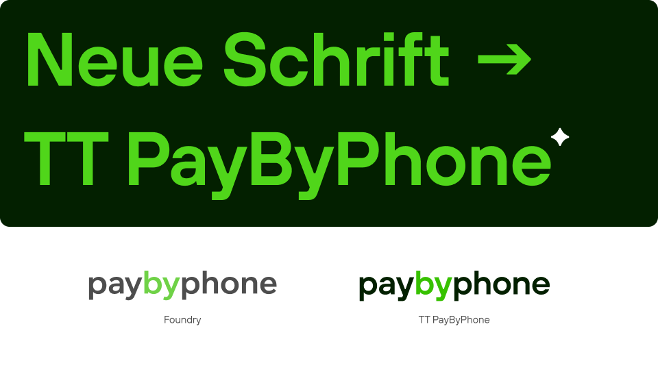 Mit TT PayByPhone haben wir eine eigene Schriftart eingeführt, die wir gemeinsam mit dem renommierten Schriftstudio TypeType entwickelt haben. Sie ist flexibel, dynamisch – und vor allem in jeder Größe klar und gut lesbar.